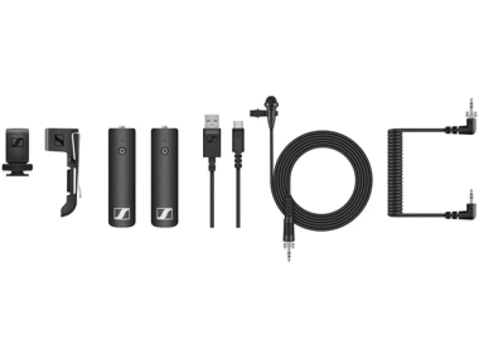 XS Wireless Digital Portable Lavalier Set. One-touch ease-of-use wireless audio set with XSW-D 3.5mm (1/8”) transmitter, XSW-D 3.5mm (1/8”) receiver, ME2-II clip-on lavalier mic, 3.5mm (1/8″) coiled cable, cold shoe mount, belt clip and USB-A to USB-C charging cable